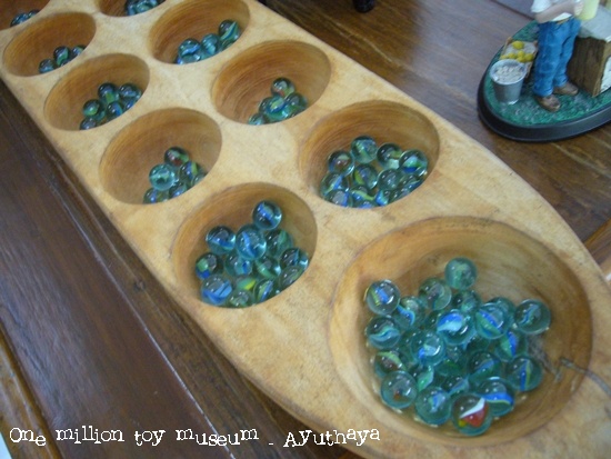 1.รางหมากขุม เป็นรูปเรือทำจากไม้ ยาวประมาณ 130 เซนติเมตร กว้างประมาณ 20 เซนติเมตร มีหลุมเรียงเป็น 2 แถว หลุมกว้างประมาณ 7 เซนติเมตร ลึกประมาณ 4 เซนติเมตร มีด้านละ 7 หลุม เรียกหลุมว่าเมือง หลุมที่อยู่ปลายสุดทั้งสองข้างเป็นหลุมใหญ่กว้างประมาณ 11 เซนติเมตร เรียกว่า หัวเมือง